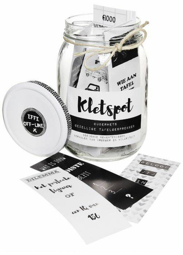 De Kletspot is een decoratieve pot vol kaarten met grappige vragen, stellingen en hilarische dilemma's. Dit gezelschapsspel brengt de ouderwetse gezellige tafelgesprekken weer terug in de huiskamer.